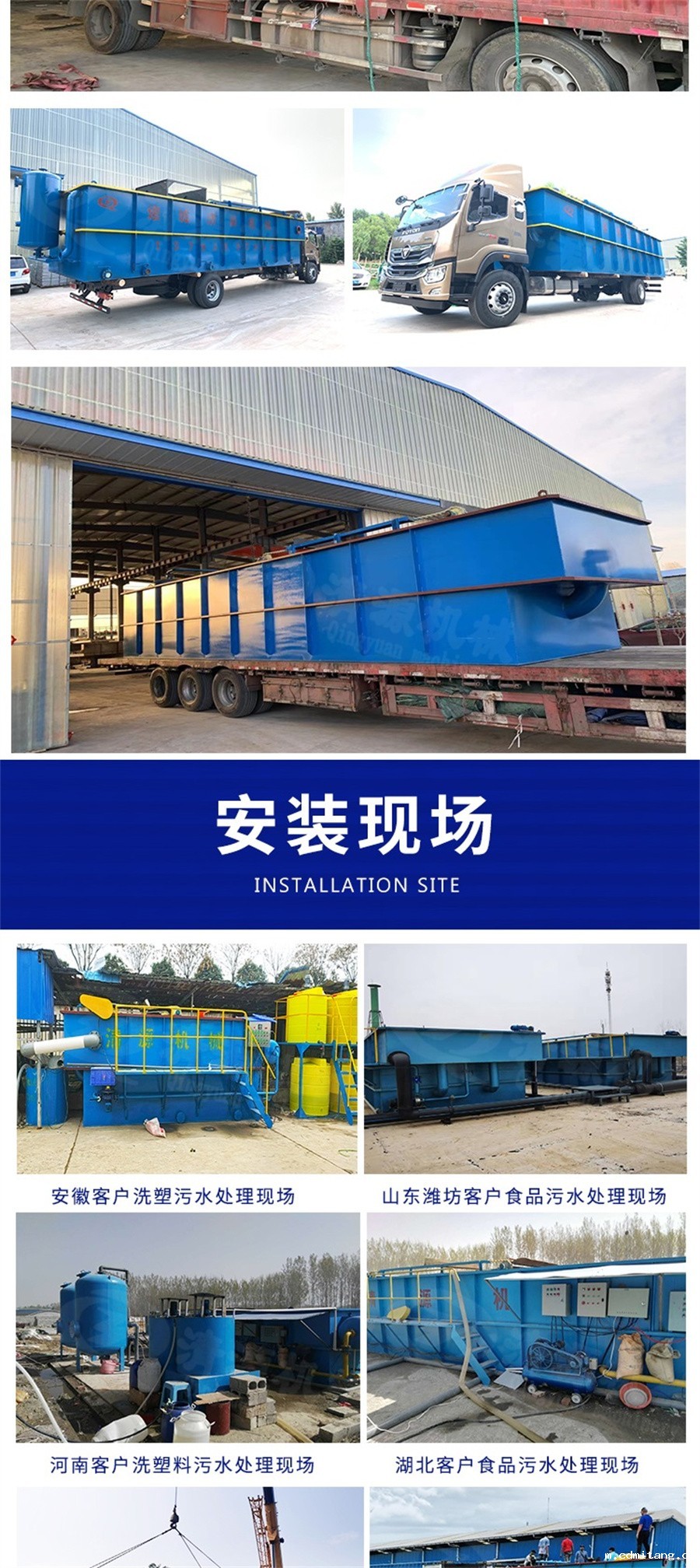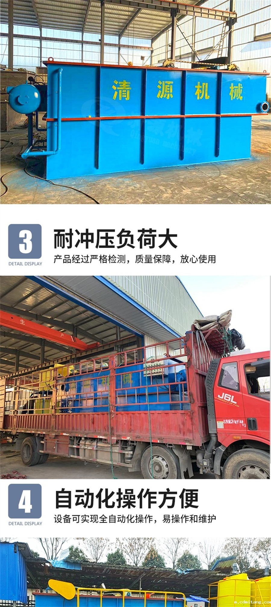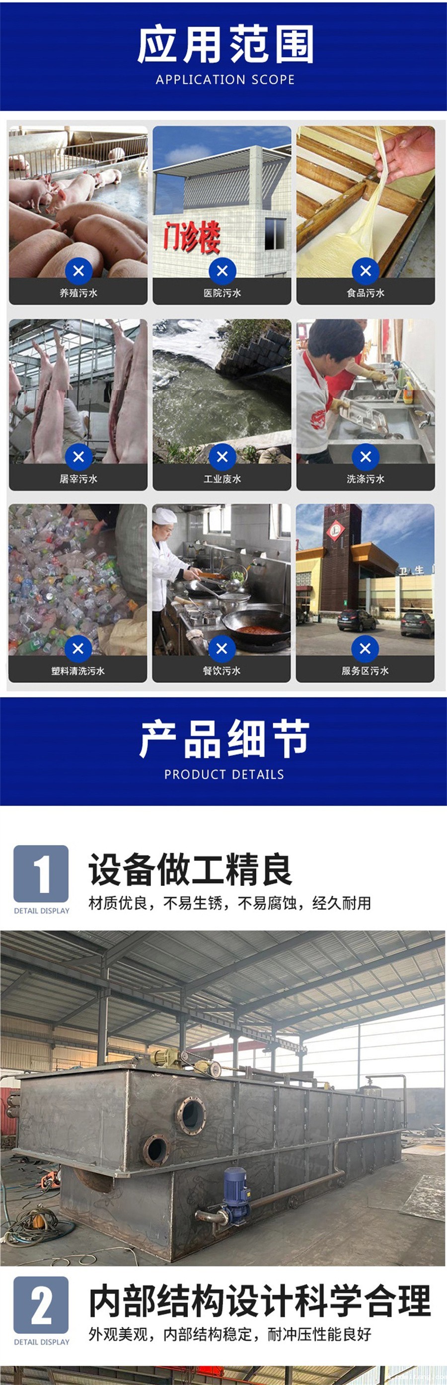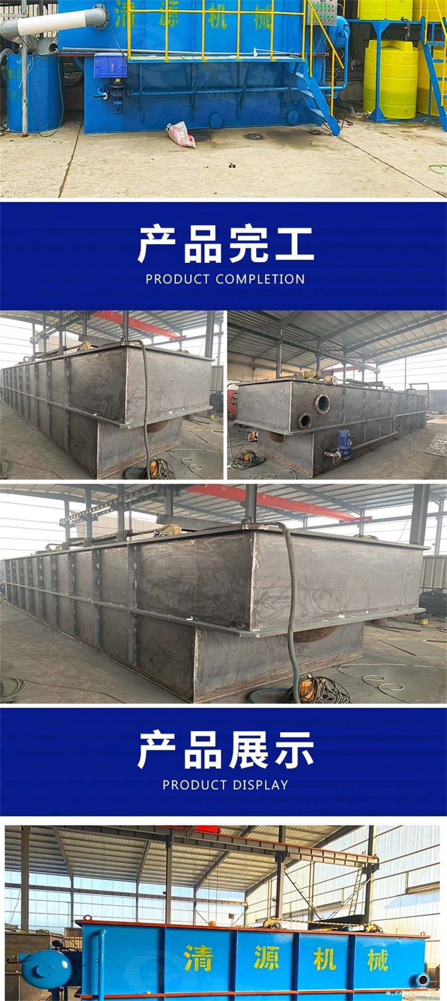 结构特点:设备主体为长方形钢制结构。主要部件由溶气泵、空压机、溶气罐、长方形箱体、气浮系统、刮泥系统等组成。