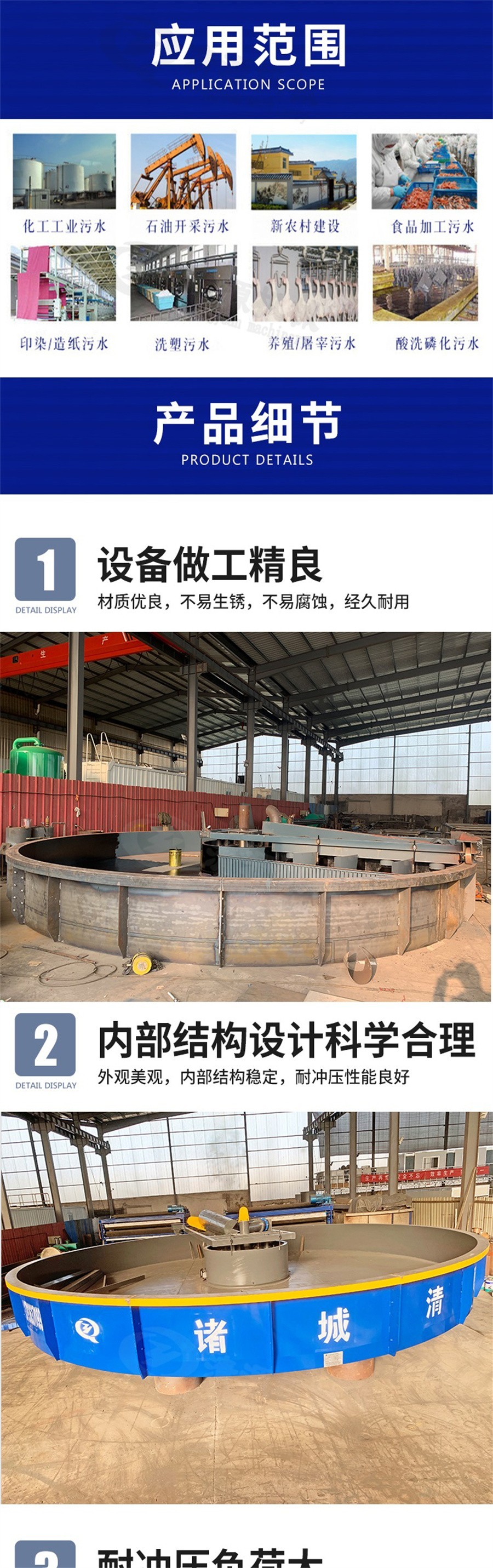 四、高速浅层气浮机应用范围:该设备以先进的设计,优良的性能,广泛应用于石油、化工、钢铁、制革、电力、纺织、食品、酿造、市政等行业的污水处理系统,是传统气浮设备的替代产品。