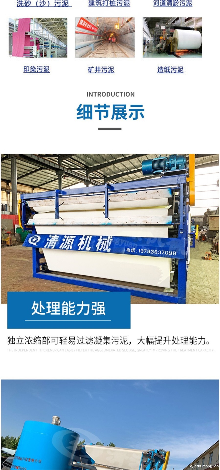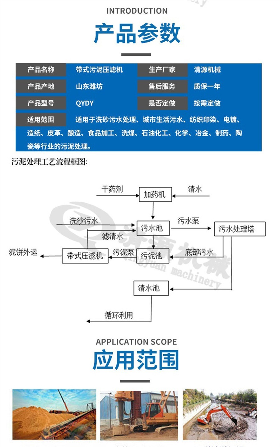 带式压滤机广泛应用于城市生活污水、纺织印染、电镀、造纸、皮革、酿造、食品加工、洗煤、石油化工、化学、冶金、制药、陶瓷等行业的污泥脱水处理,也适用于工业生产的固分离或液体浸出工序。