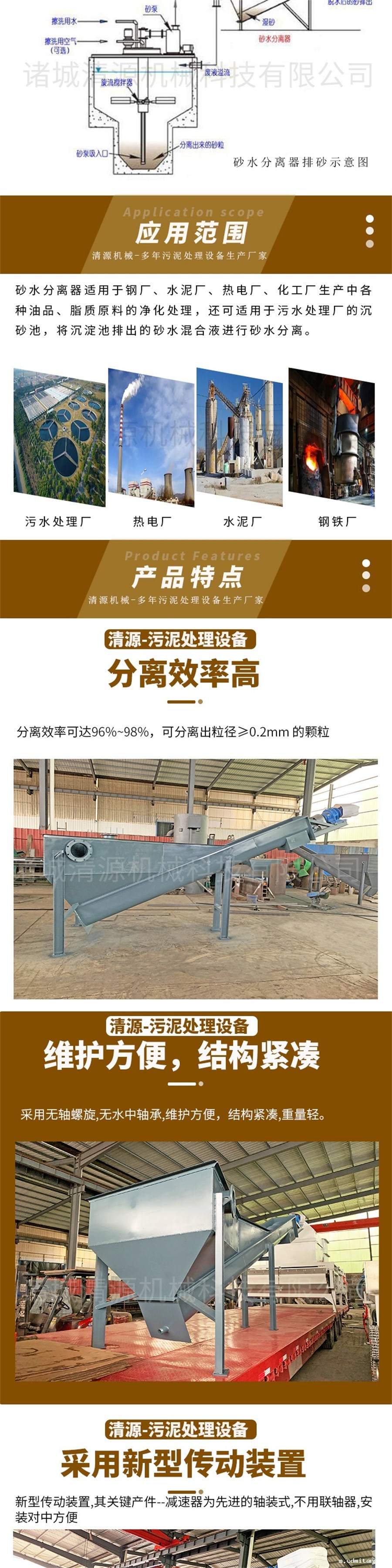 用于将城市污水处理或工业废水处理中的沉砂池排出的砂水混合液进行砂水分离。