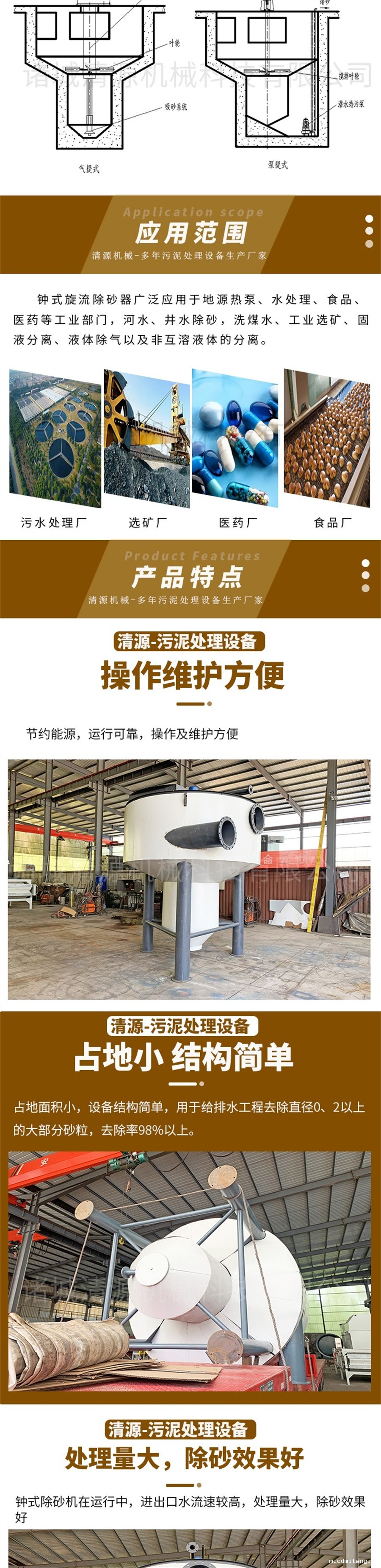 钟式旋流除砂机系统在运行中,进出口水流速较高,处理量大,出砂效果好,占地面积小,设备结构简单,节约能源,运行可靠,操作及维护方便,适合大中小型污水处理厂使用。