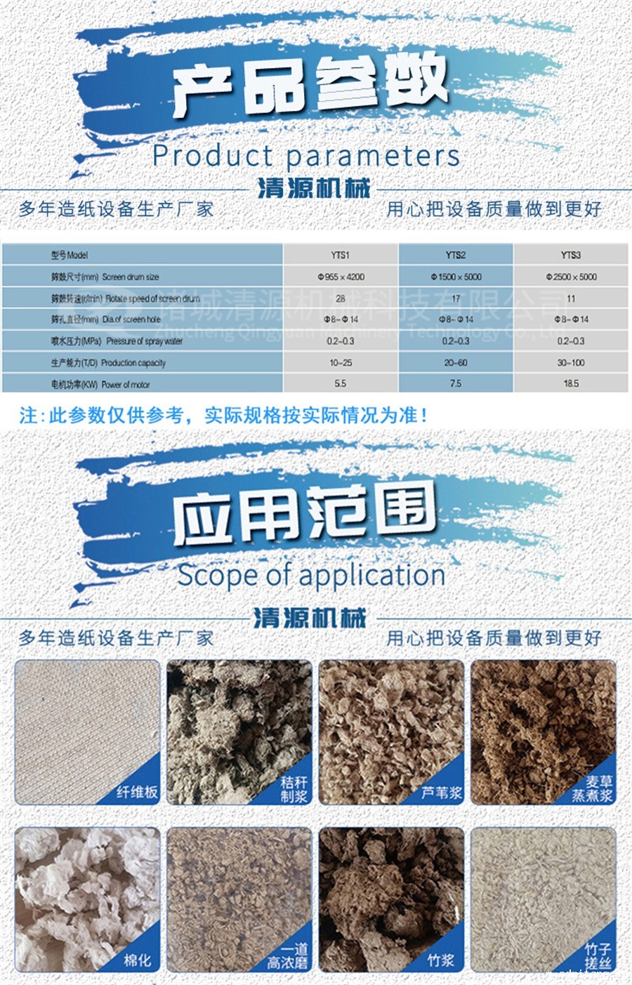 YTS系列圆筒筛用于废纸制浆生产流程水力碎浆机之后,对碎解的废纸进行粗选,除去较大杂物,以减轻后续筛选设备的负担。新型圆筒筛具有生产能力大、筛选效果好、结构简单、维修方便等优点。