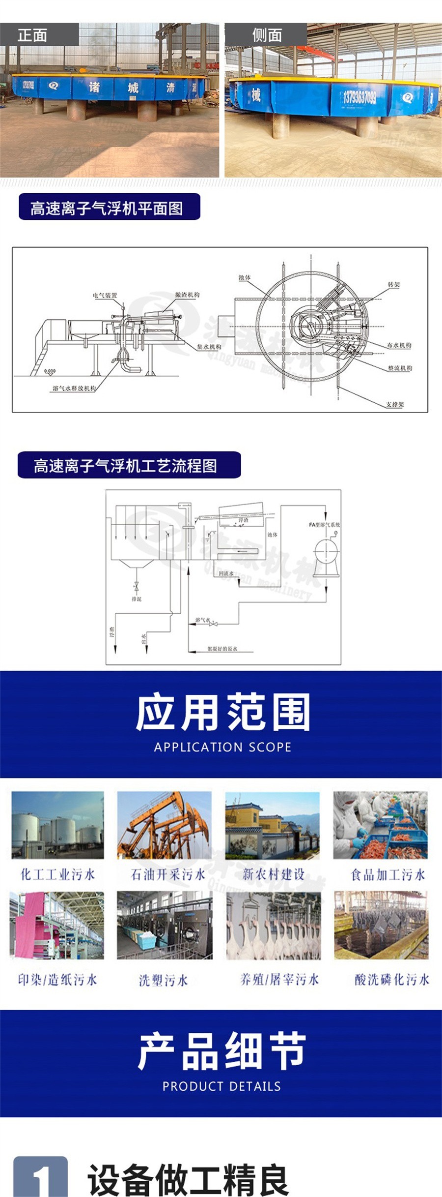 四、高速离子气浮机应用范围:该设备以先进的设计,优良的性能,广泛应用于石油、化工、钢铁、制革、电力、纺织、食品、酿造、市政等行业的污水处理系统,是传统气浮设备的替代产品。