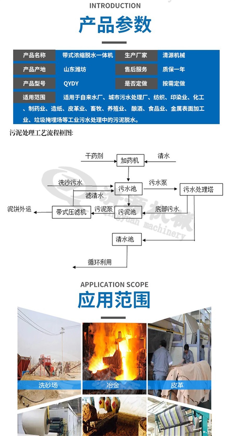 带式浓缩脱水一体机适用于自来水厂、城市污水处理厂、纺织、印染业、化工、制药业、造纸、皮革业、畜牧、养殖业、 酿酒、食品业、金属表面加工业、垃圾掩埋场等工业污水处理中的污泥脱水。